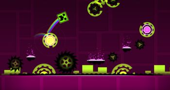 当你打开几何冲刺,首先映入眼帘的是那五彩斑斓的世界。游戏中的赛道由各种几何图形组成,如圆形、三角形、矩形等,这些图形以不同的颜色和形状交织在一起,形成了一幅幅美丽的画卷。在这充满活力的世界里,你将感受到前所未有的视觉冲击。